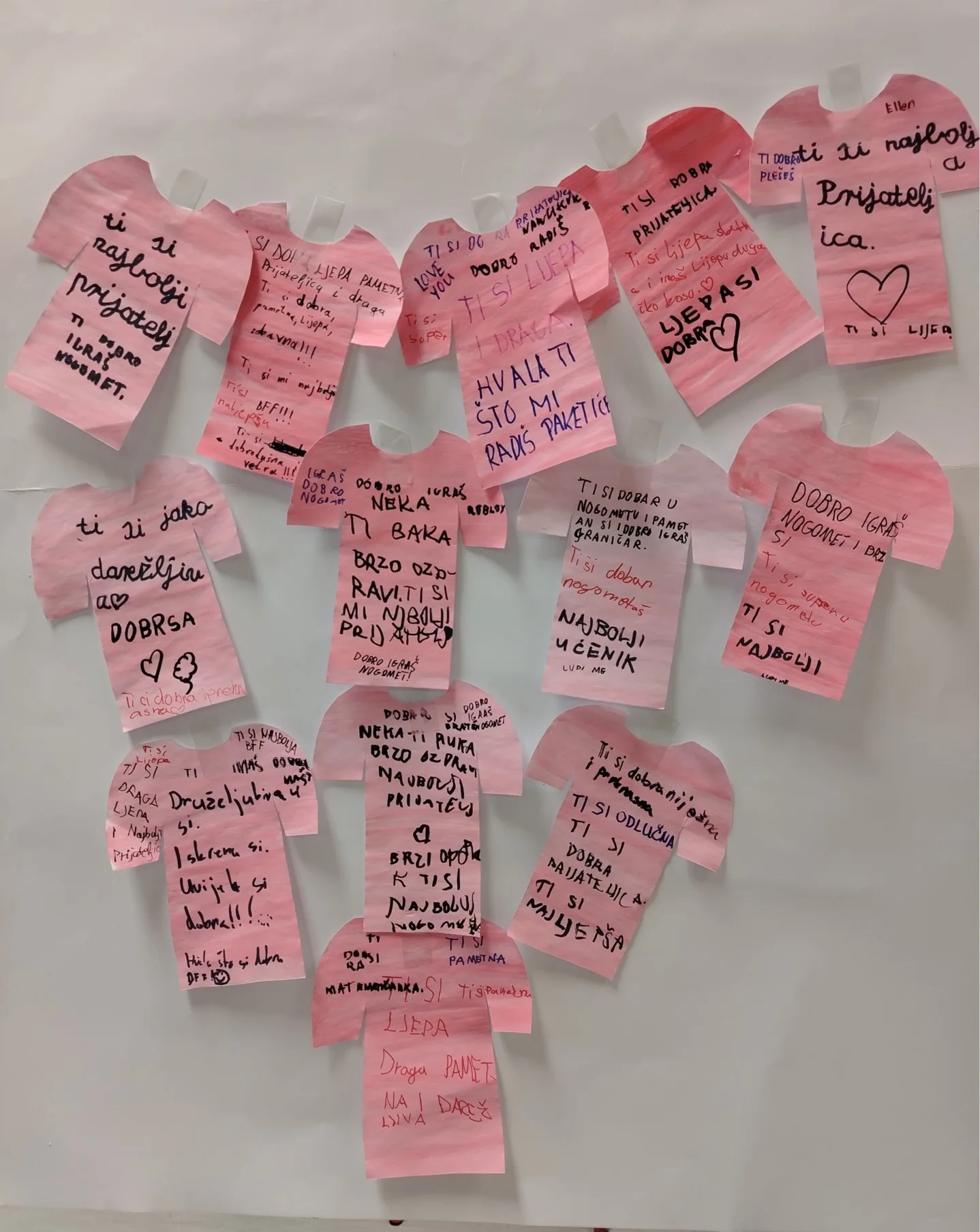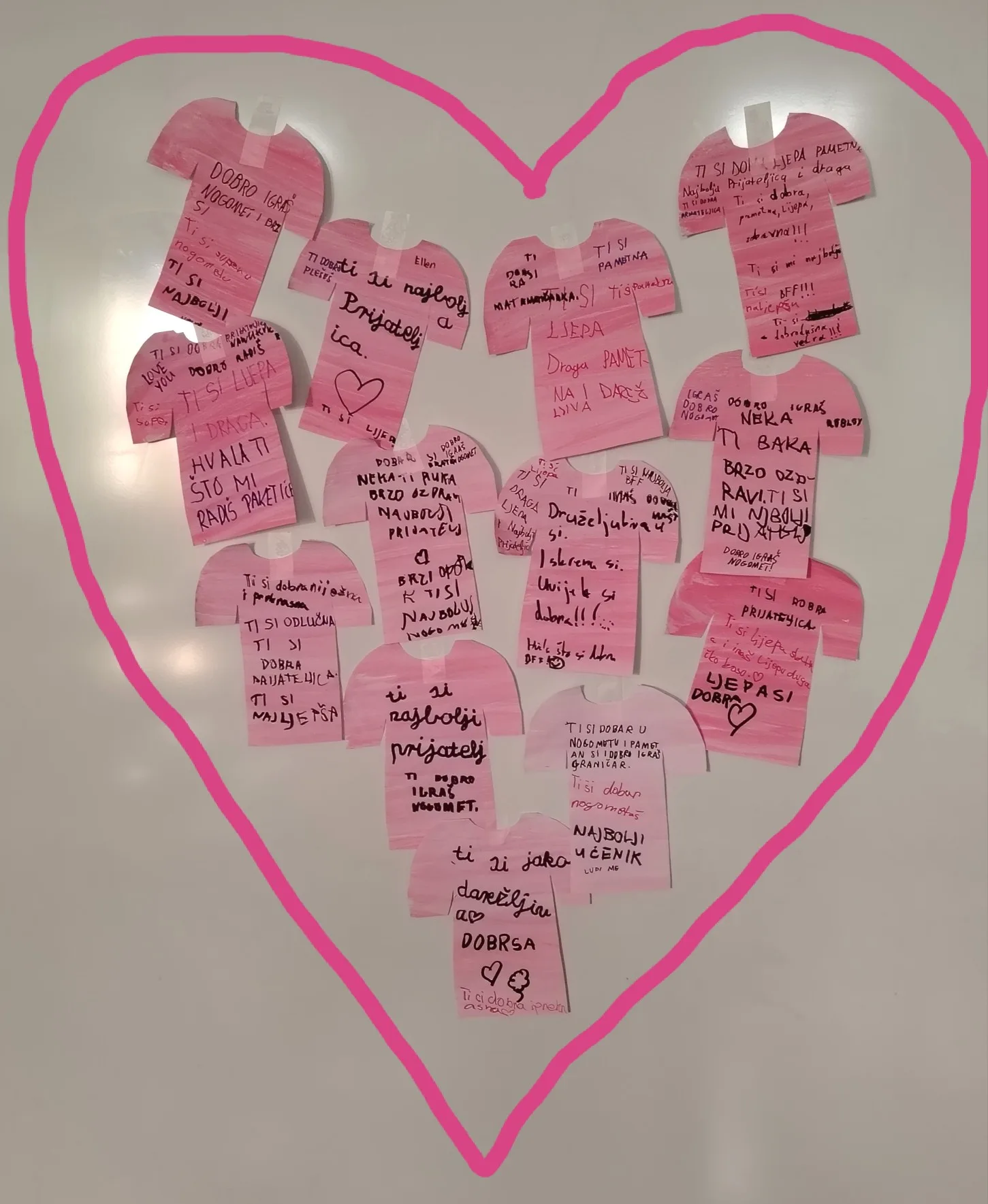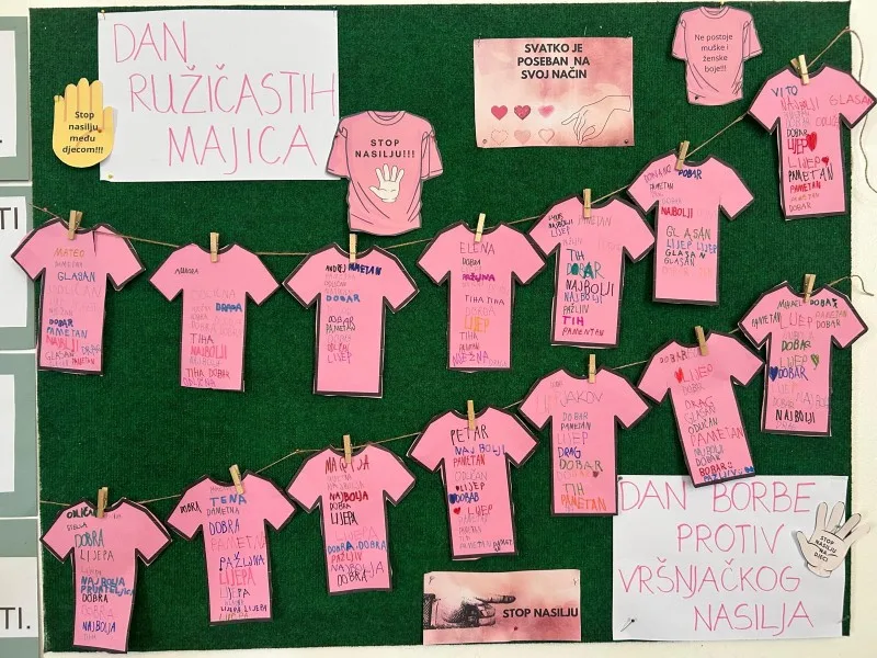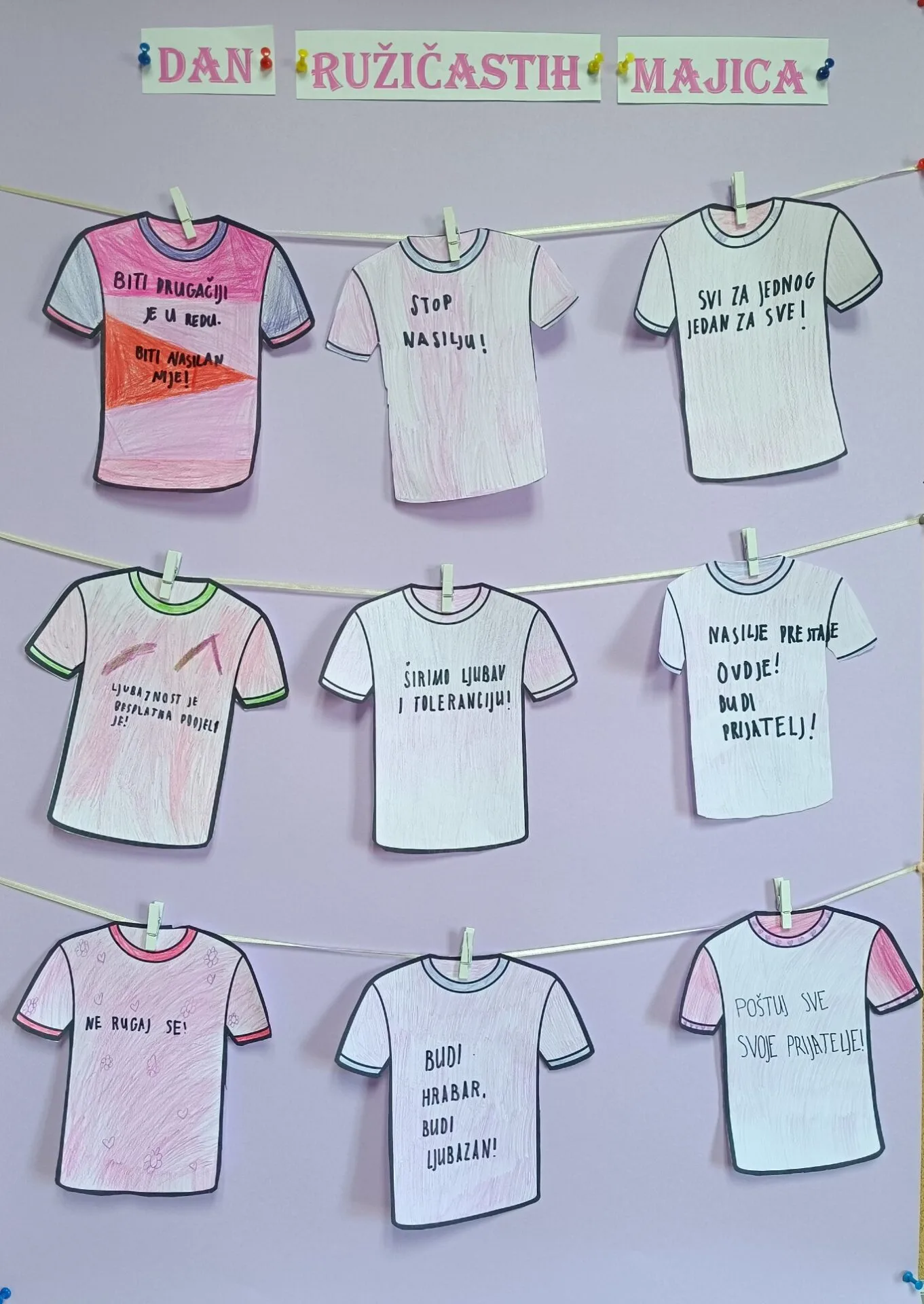 „Dan ružičastih majica obilježili smo na Vaš predloženi način. Učenici (1. razred) su bili vrlo zainteresirani za rad i jedva su čekali pročitati osobine na svojoj majici koje su za njih napisali drugi učenici. Šaljem izgled našeg panoa, kako smo ga na kraju uredili. Veselimo se Vašim ostalim idejama!„